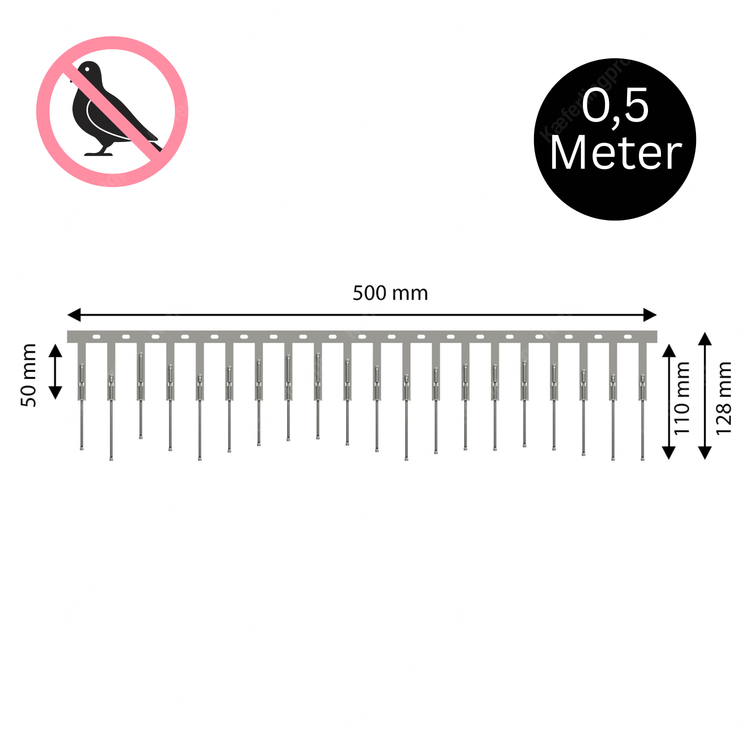 Las puntas tienen un grosor de varilla de 2,0 mm, una longitud de punta autoajustable de 110 mm (incluido el listón 128 mm) o 170 mm (incluido el listón 188 mm) y una separación regular de 25 mm entre puntas, con una longitud de 500 mm por elemento y una fabricación de alta calidad en acero inoxidable 1.4301 resistente a la corrosión.